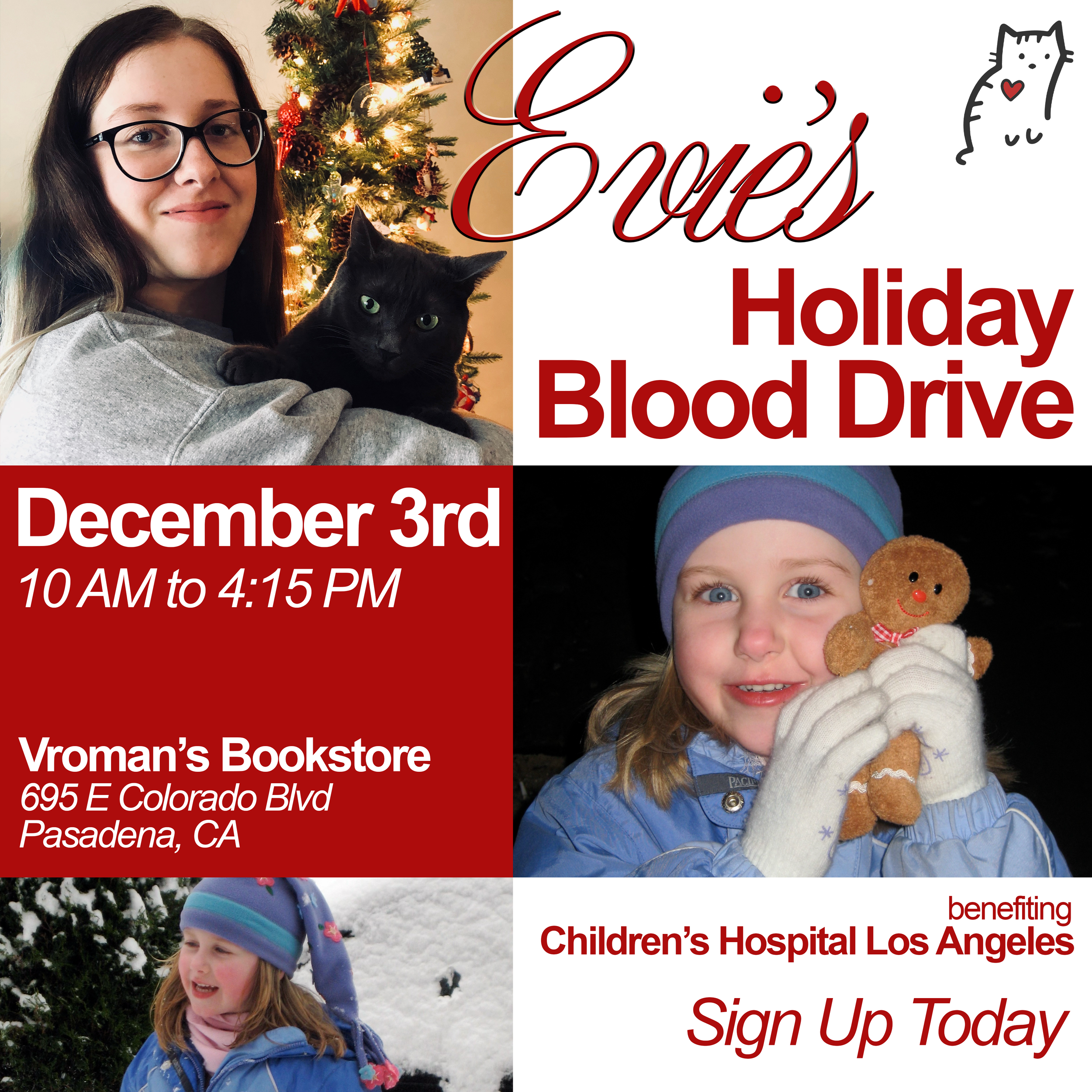 We will be hosting our Holiday Blood Drive on December 3rd from 10 AM to 4:15 PM, at Vroman’s Bookstore.